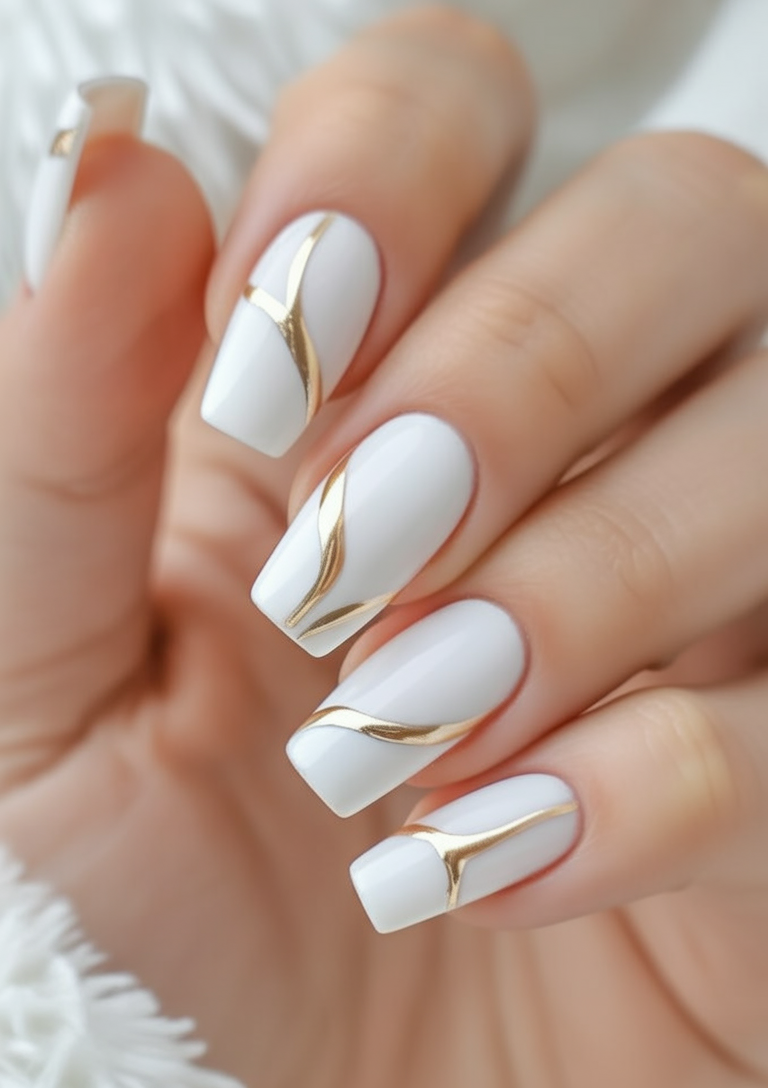Chic and bold, this geometric design takes simple white nails and transforms them into modern art. The gold lines curve gracefully across the matte surface, creating movement and visual interest. It’s stylish, edgy, and the perfect statement for women who love fashion-forward ideas.