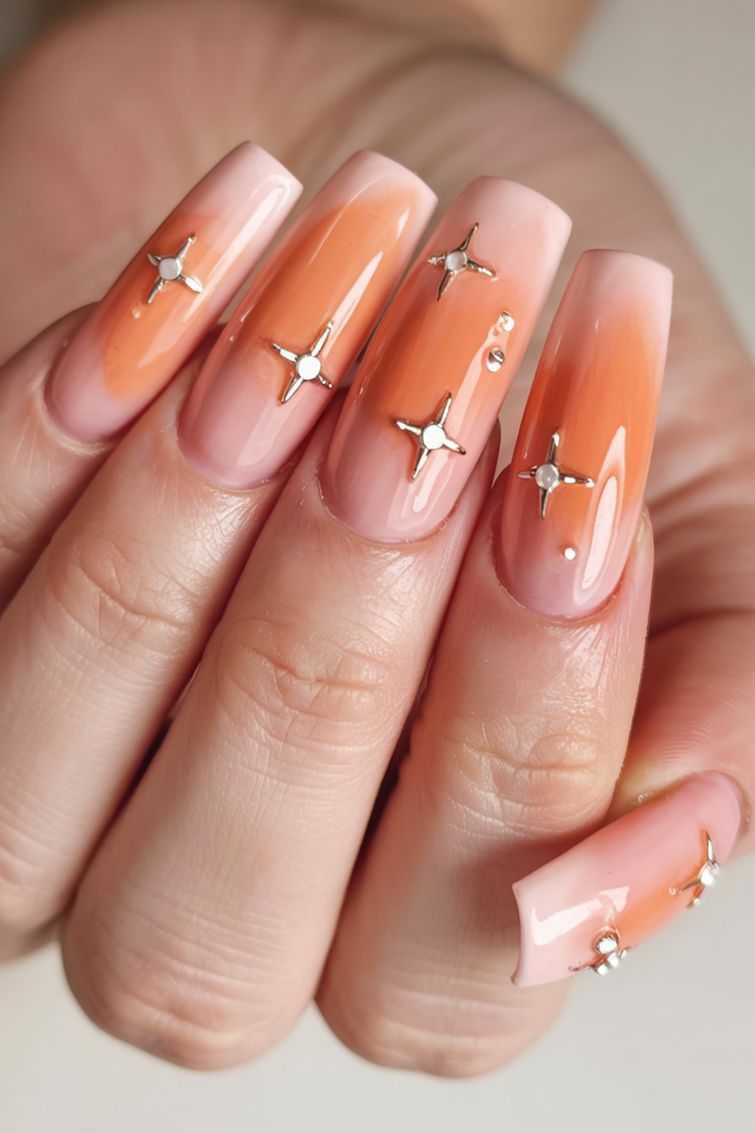 Sweet, juicy orange melts into mild peach, yet what stands-out the most here? The small metallic accents were sprinkled like stars each nail. It is a sunny cosmic-chic appearance.