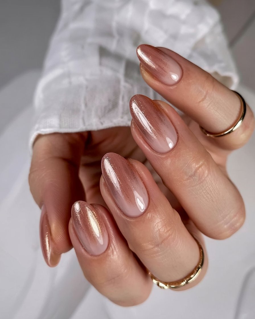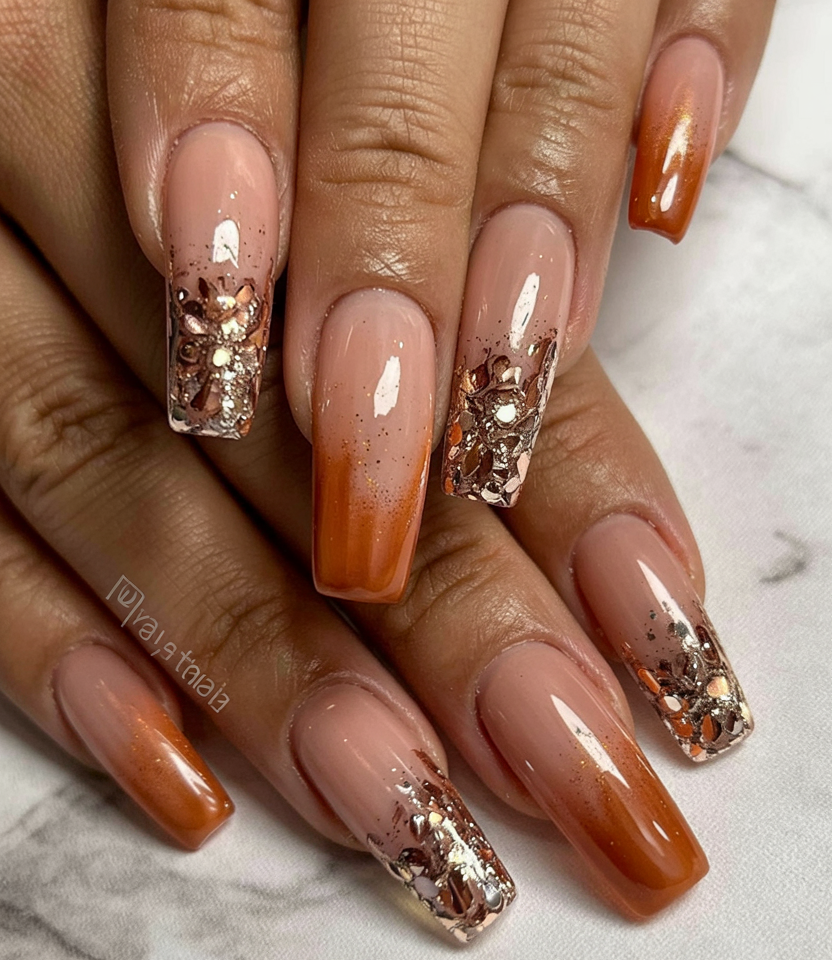 Those who are more conservative and work in a professional environment will appreciate this minimal shine on this fall ombr mineral nail look 2025. In case you are a soft-glam visioner, this is one to keep. Wear out with simple gold rings and creamy tones to have a sleek and elegant result.