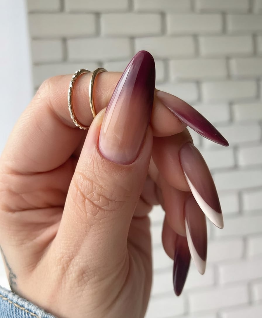 Sharp, sultry, and downright dramatic — this burgundy stiletto look is like a glass of bold red wine with a hint of mischief. It has that quiet confidence you don’t need to explain. The fade into soft beige keeps it grounded and ultra-wearable.
