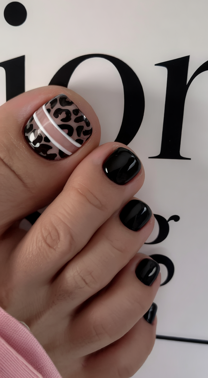 This enough-is-enough black lacquer helps out playful leopard in bite fore play pedicure. Pink and black contrast is always up to date and the neat stripe makes this not to be over-the-top.