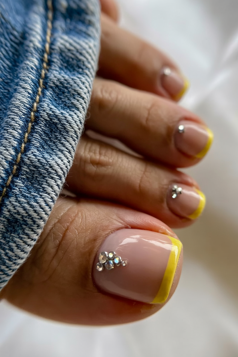 New, fresh and with a lot of bling, this new rendition of the french tip features the use of sunny yellow at the edge and crystal ornamentation. It is light in color with a nude base and the rhinestones are so festive.
