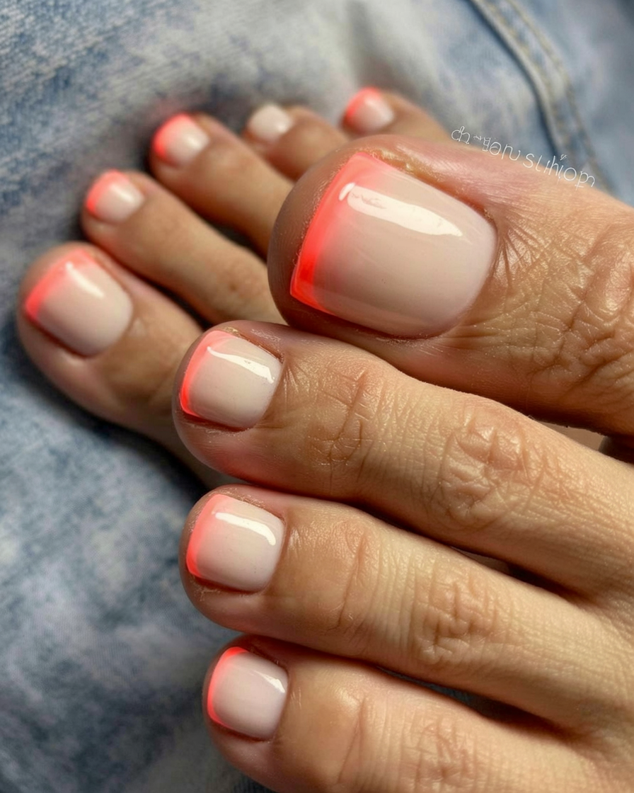 Classic meets bold in the most stylish way possible. This neon tip coral adds life to this milky neutral base, and makes a simple french tip something boldly new by autumn 2025.