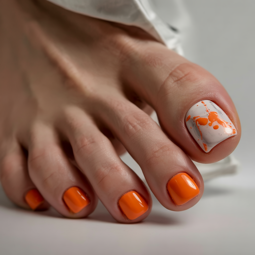 If you’re the artsy type, this one’s for you. Orange toes stand out on their own merit but what makes it appear like a mini masterpiece is the paint-splash effect on the big toe. Abstract and effortless.