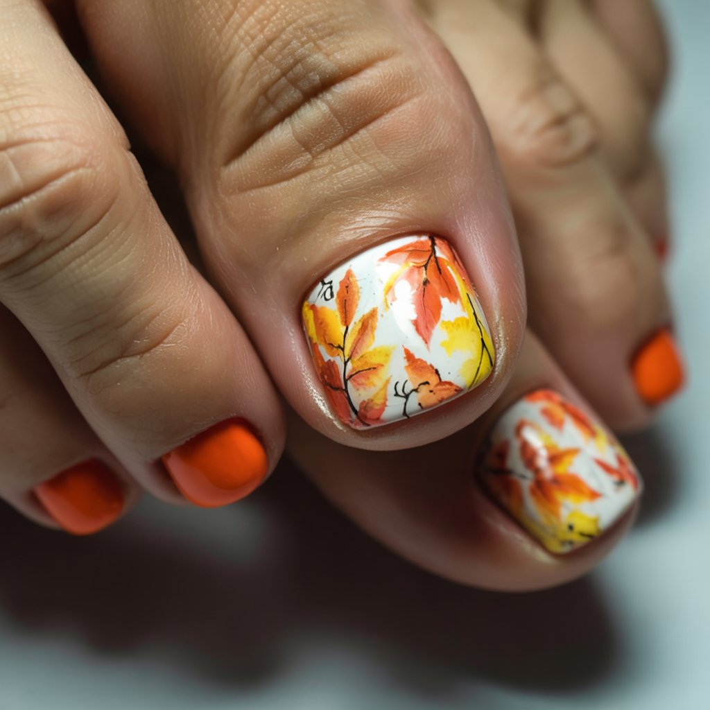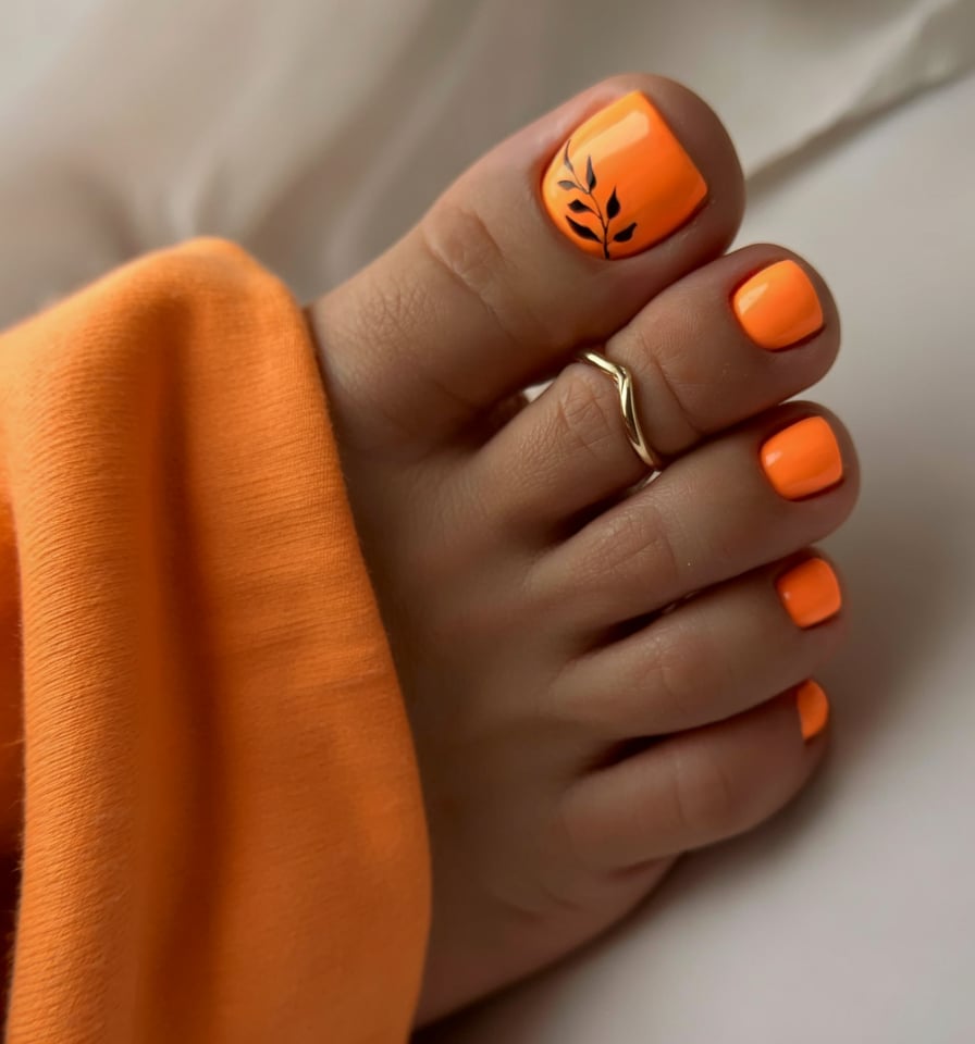 This tousled tangerine color has a sunset effect on the toes. The pattern of little leaves on the big toe adds enough seasonal flourish that is not kitchsy.