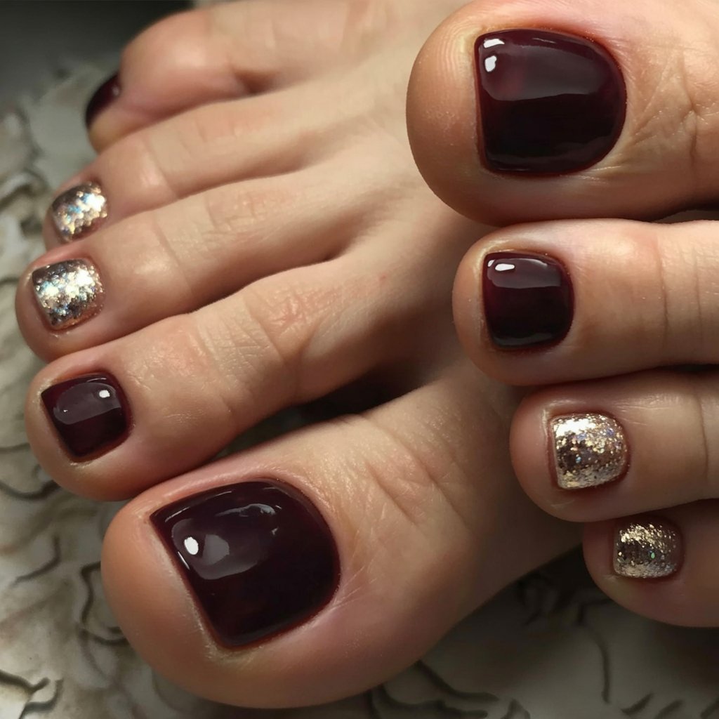 Nothing says sophisticated like a good burgundy-colored glossy shade, but what makes it even better is when it is combined with champagne-colored glitter. This duo is festive but serious as a glass of red wine with a golden glass.