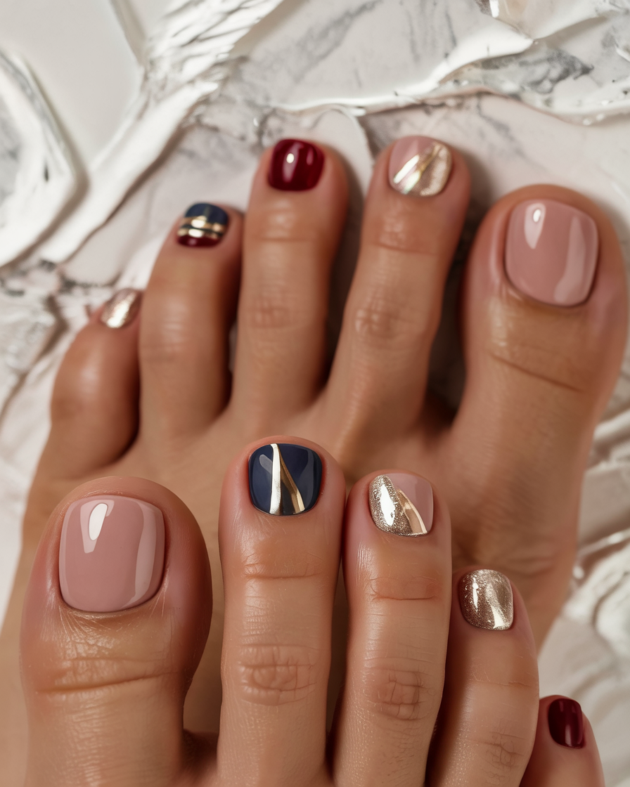 This fall type is your best cashmere lover scarf – posh, polymorphous and nonchalantly fashionable. A creamy nude ground with bright Navy and burgundy toppings, and metallic gold foil stripe are what make this fall pedicure look modern and warm at the same time.