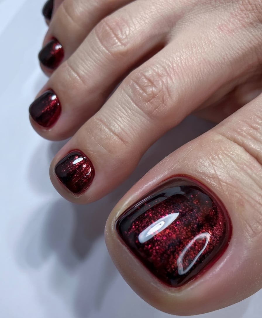 It is suitable on short nails and medium nails, making it an adorable and popular autumn trend. The pedicure goes with all skin tones and particularly enhancing to the lighter skin against darker reds.