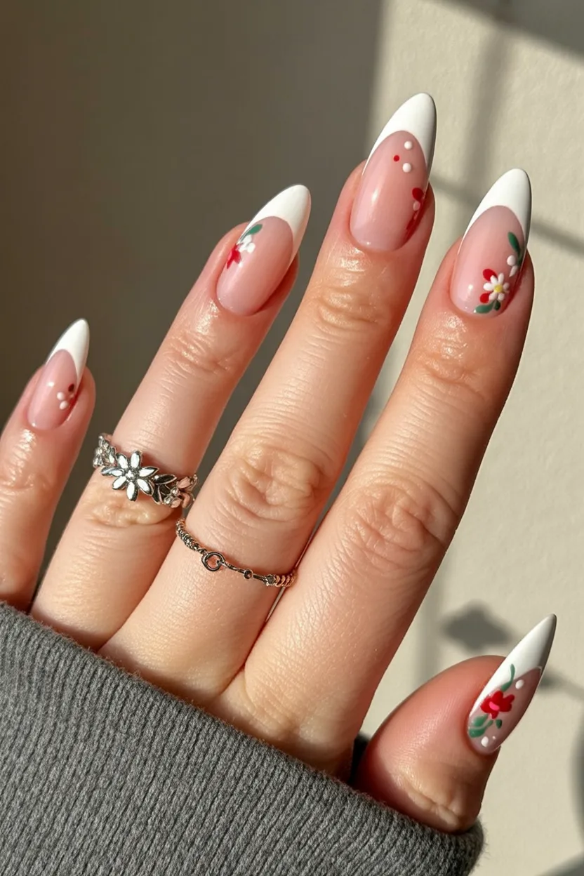 7. Soft French Tips with Tiny Red Florals