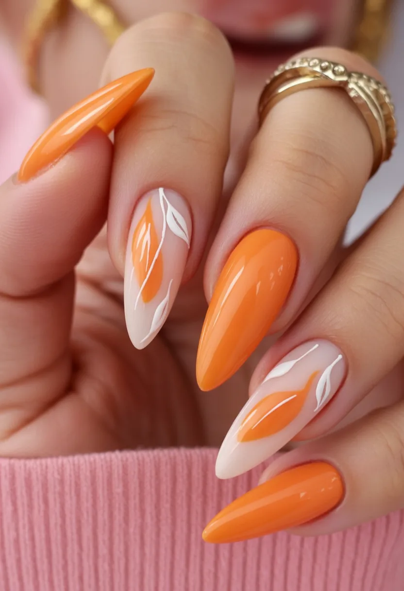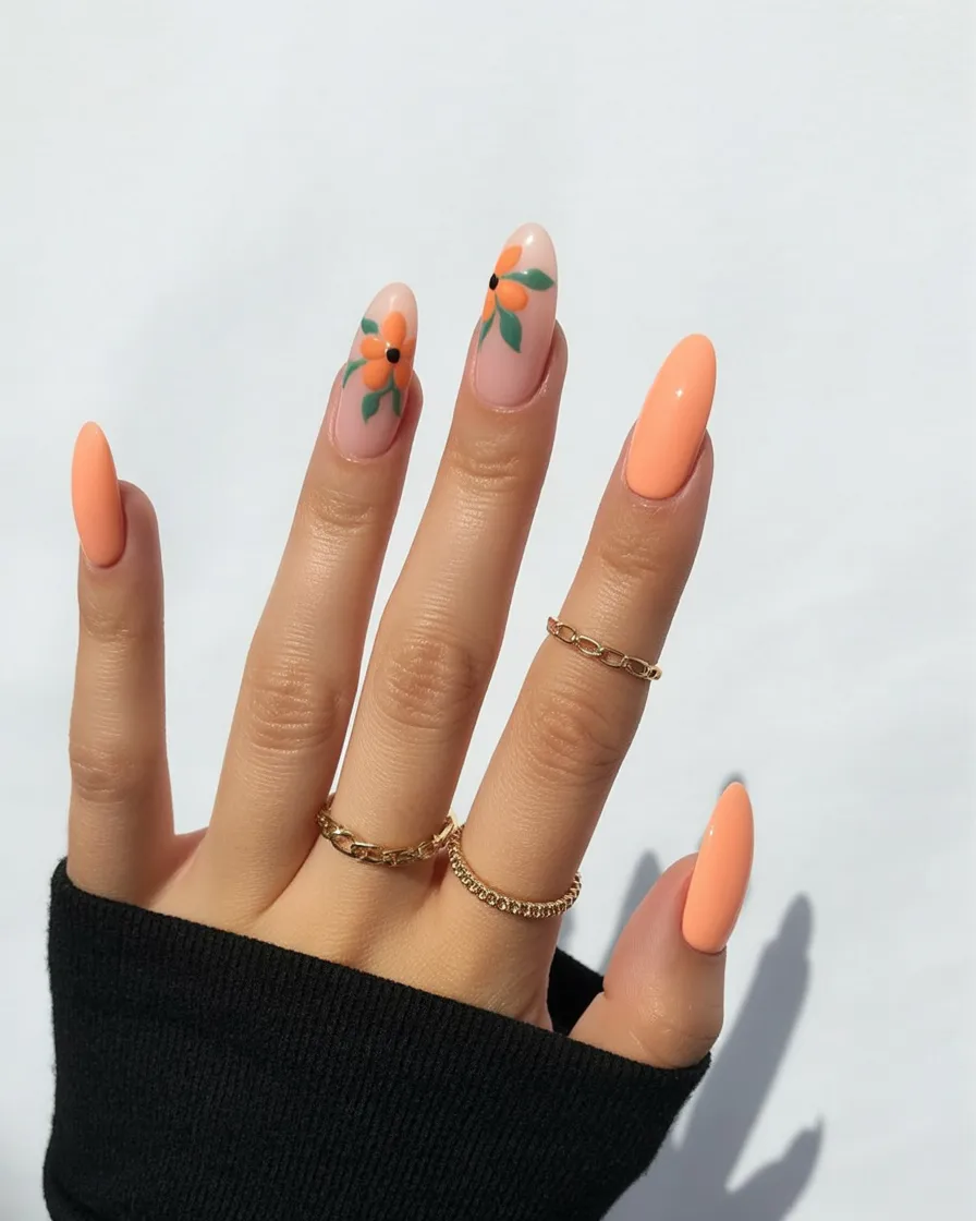 19. Warm Orange Almond Nails with Botanical Florals