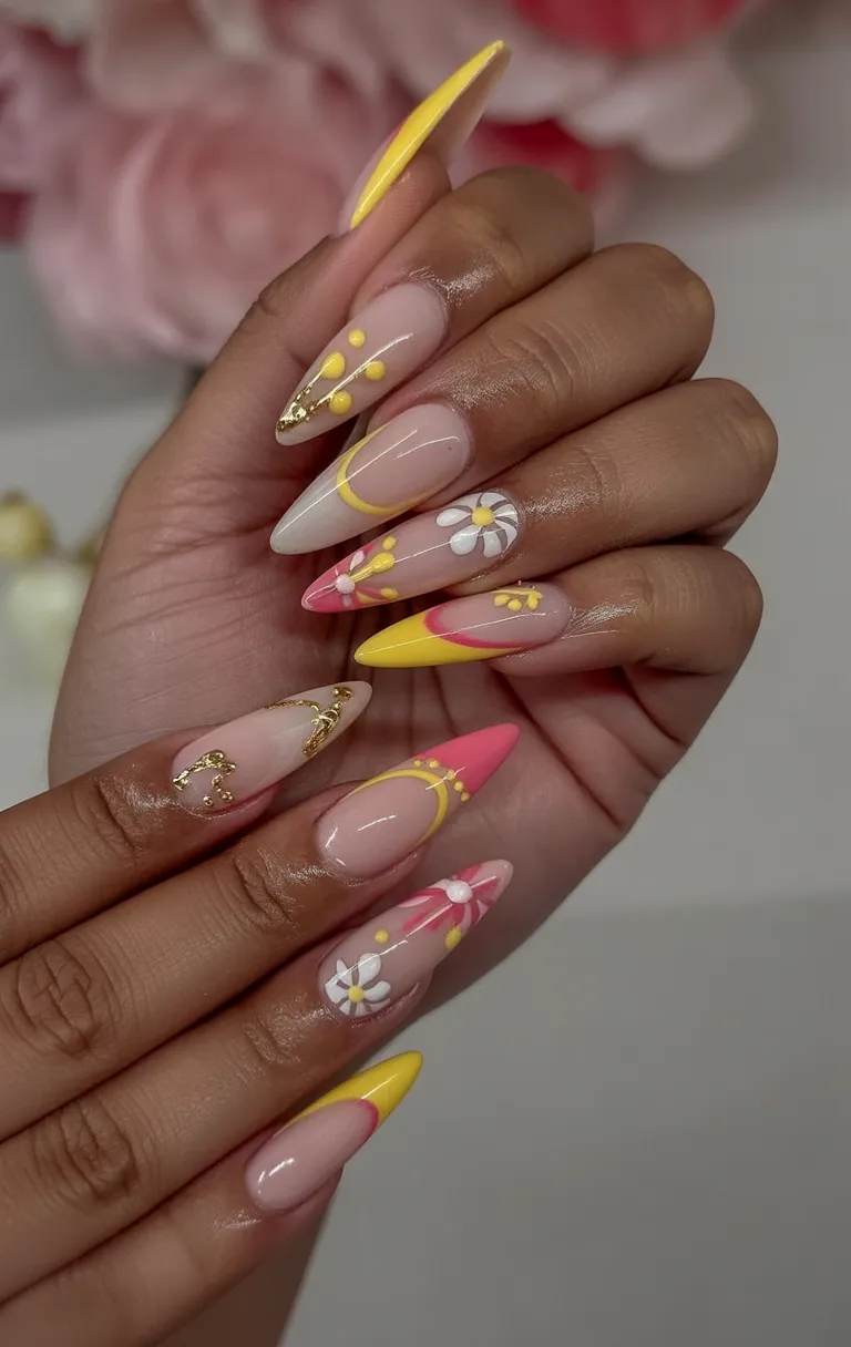 8. Playful Pink and Yellow Floral Almond Nails