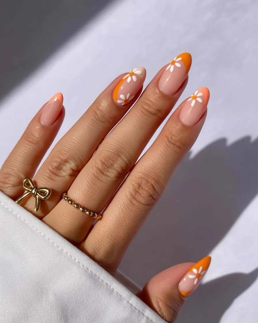 22. Peachy Nude Nails with Orange Daisy Accents