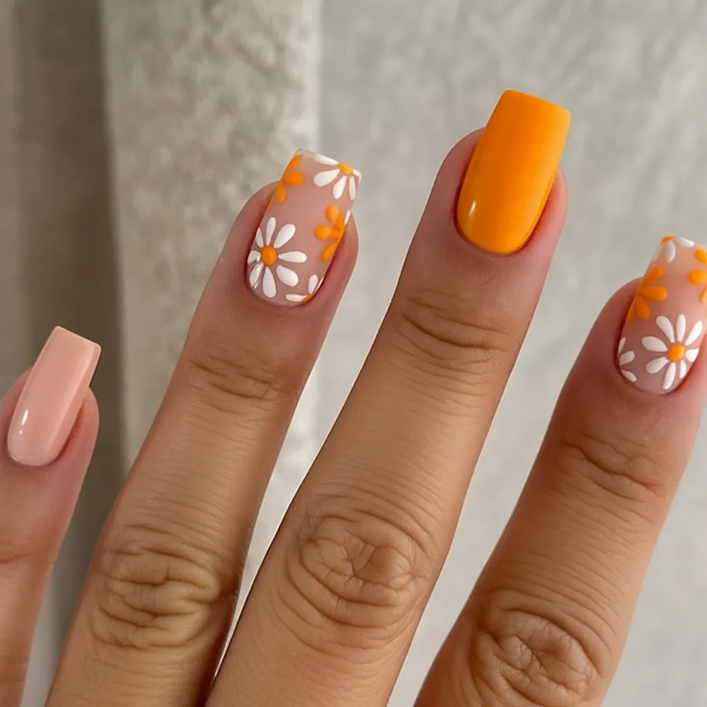 23. Short Square Orange and Daisy Nail Design