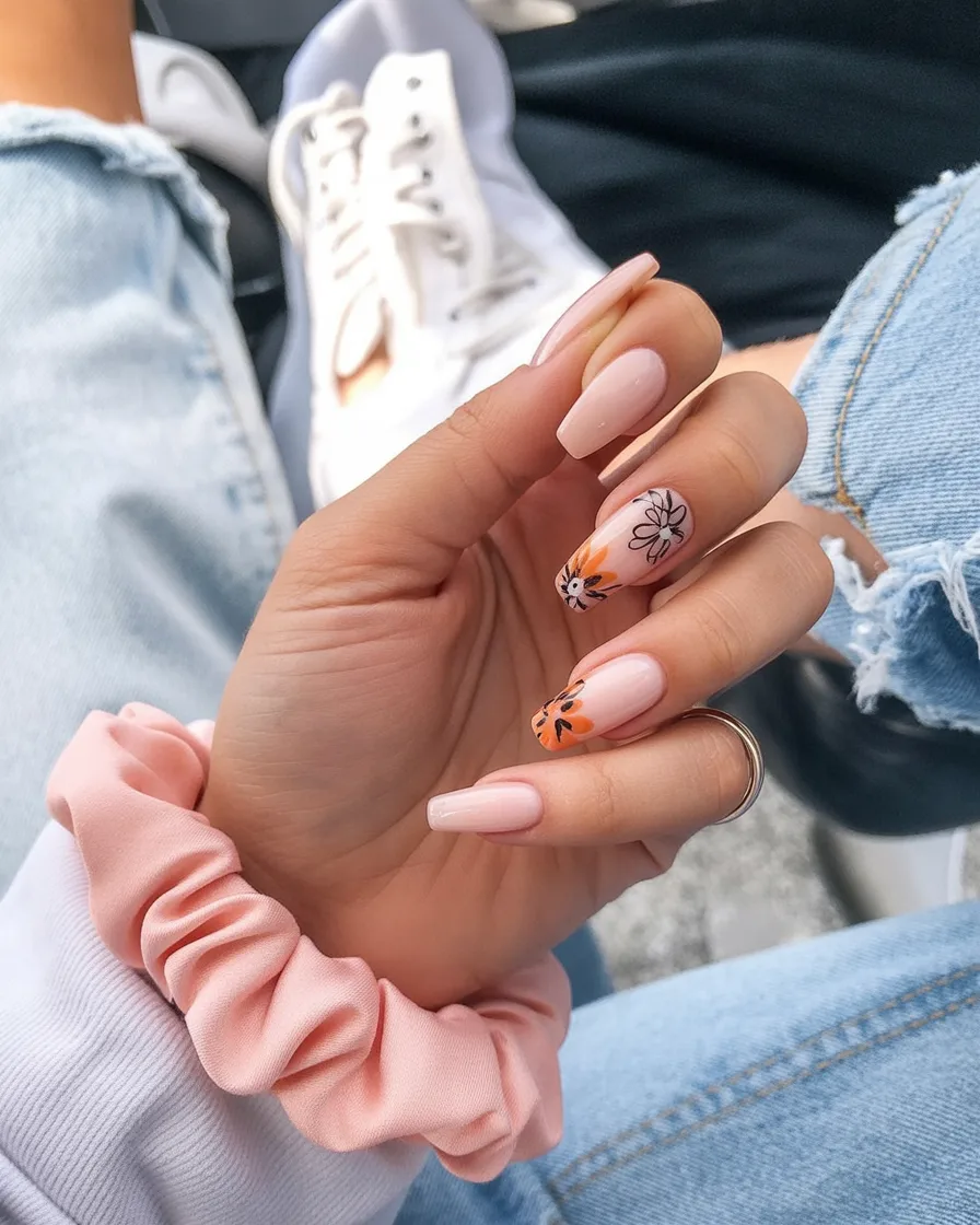 3. Casual Nude Nails with Playful Floral Accents