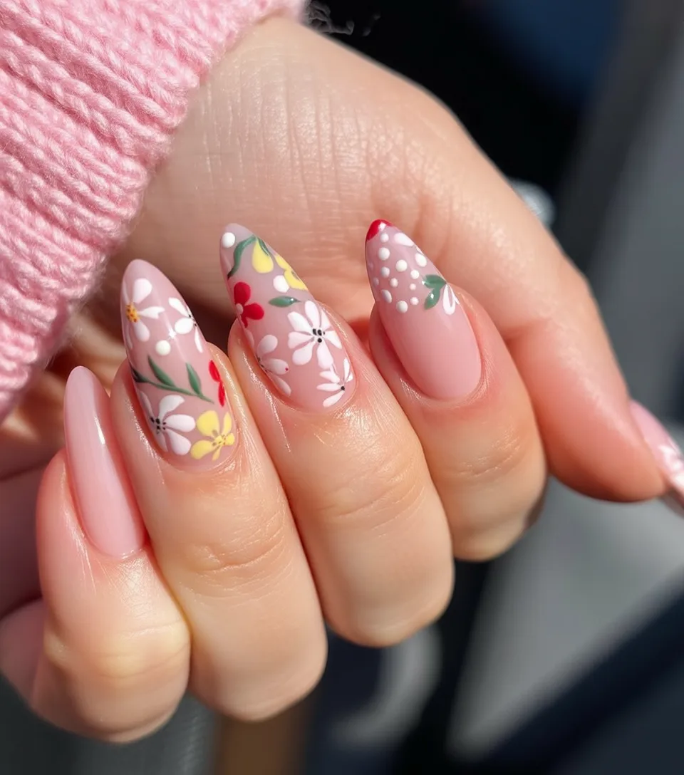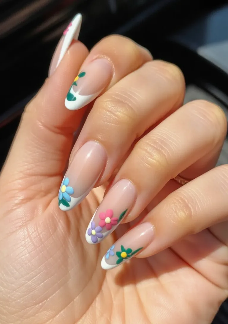 20. Soft French Almond Nails with Pastel Floral Accents