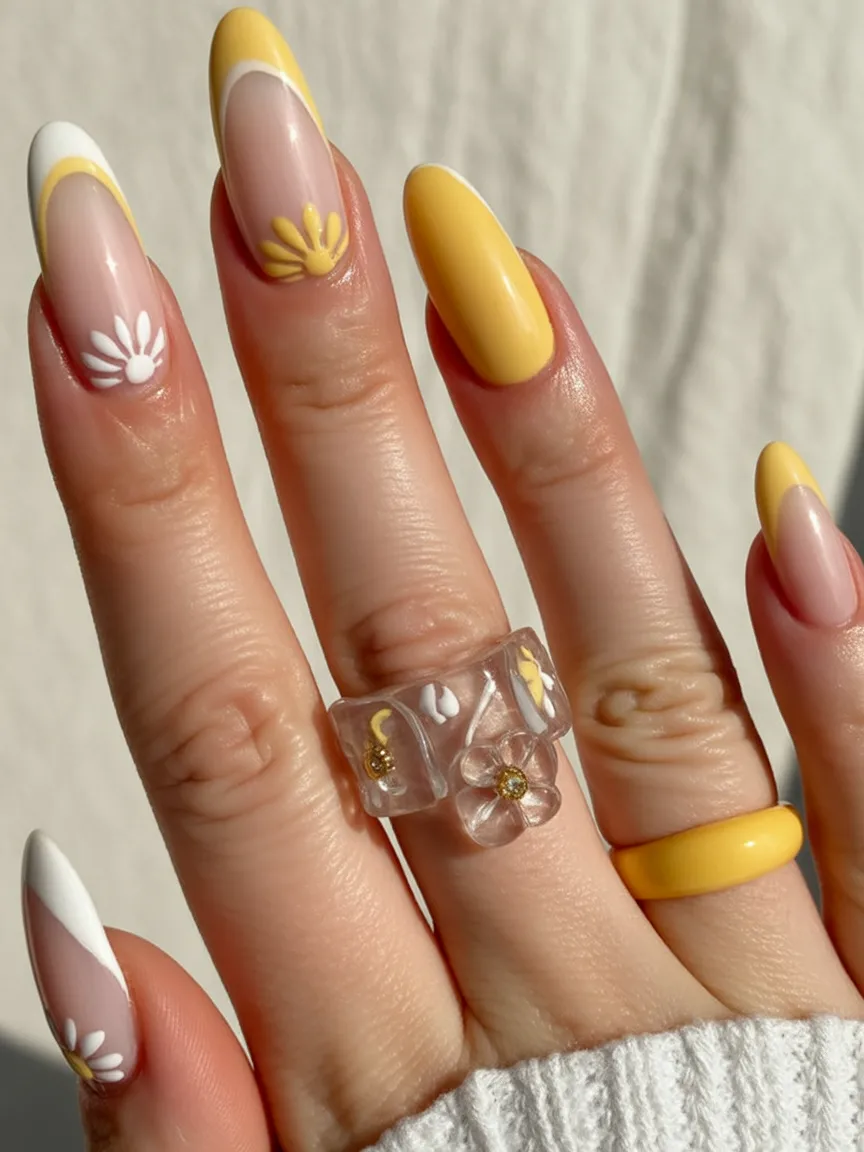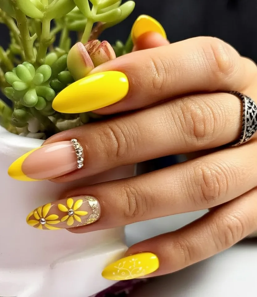 6. Sunny Yellow Nails with Floral Art Accents