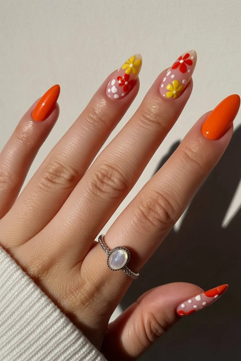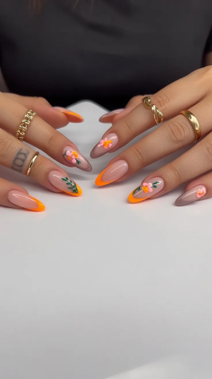 18. Nude Almond Nails with Bright Orange Tips and Florals