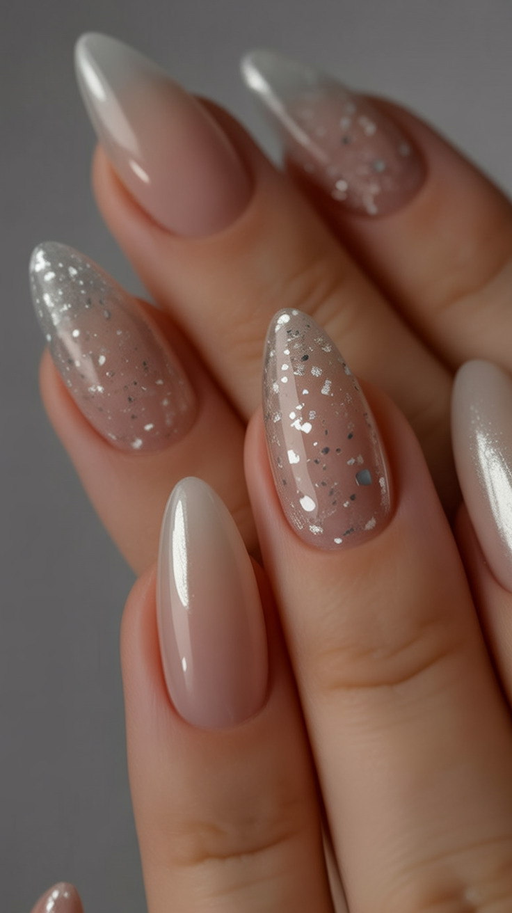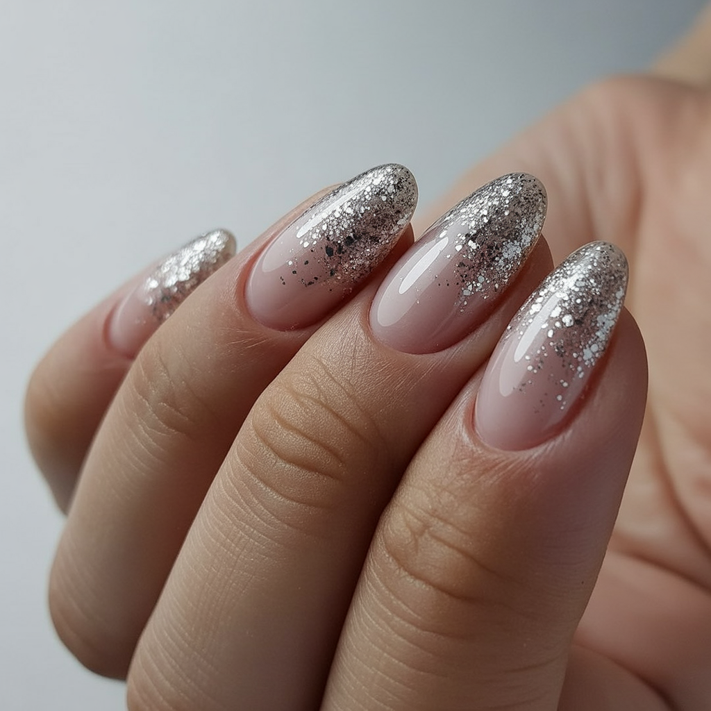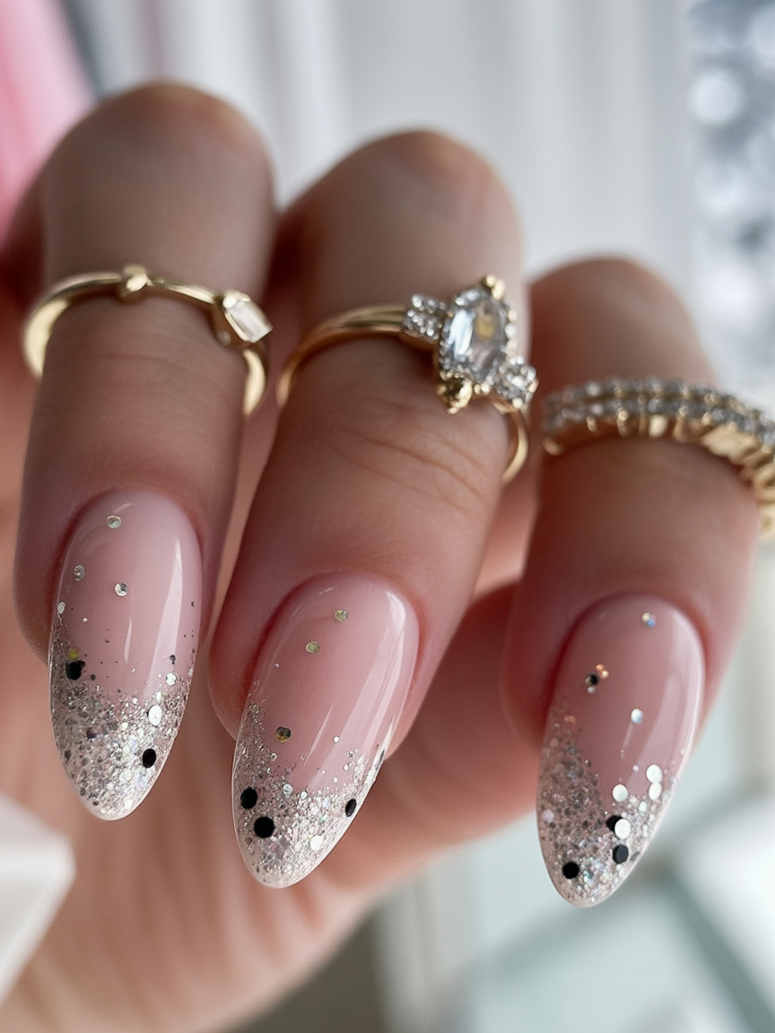 These almond nails feel like jewelry in their own right. The base is soft and natural, while the silver glitter climbs the tips like sequins on a cocktail dress. The mix of tiny and bold dots makes them playful yet sophisticated, perfect for someone who wants their nails to feel like part of their outfit rather than just an accessory.