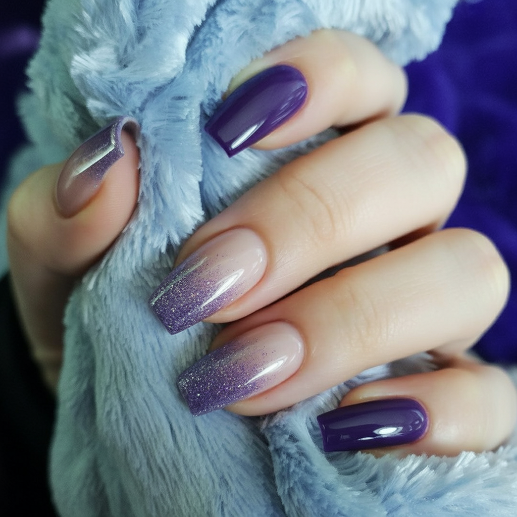 This look is perfect for women who enjoy a polished, trendy statement without stepping into anything too loud. It works especially well on medium to long nails, and the square edge adds durability. If you have fine nails that chip easily, a gel finish will help protect the design. Pairing purple with a gradient of sparkle creates a versatile style that transitions seamlessly from autumn evenings to festive holiday gatherings.