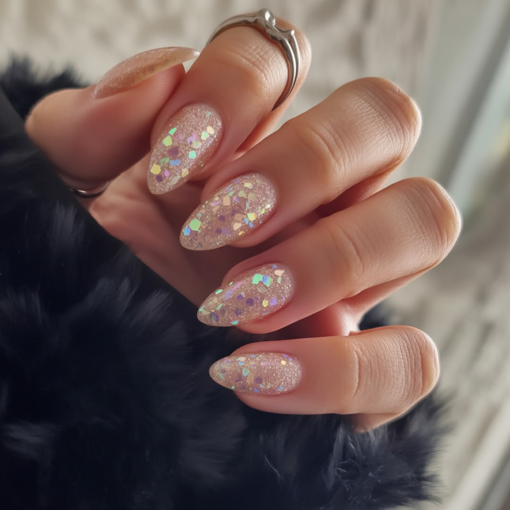 These almond nails shimmer like confetti caught in the sunlight, playful yet surprisingly chic. The multi-sized glitter pieces bring in a lighthearted energy, while the soft nude base keeps the look from tipping into over-the-top. It’s a manicure that feels celebratory, like you’re ready for a weekend brunch or a night out with your best friends.