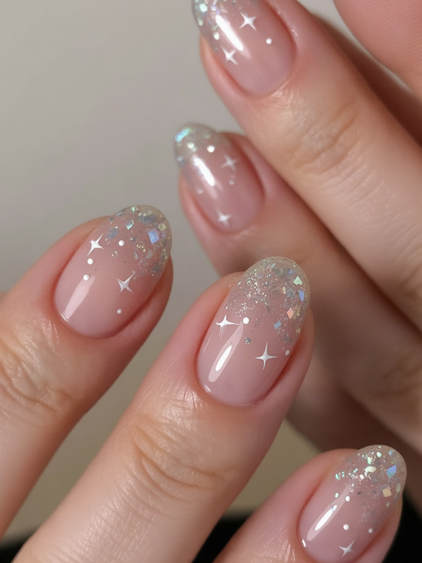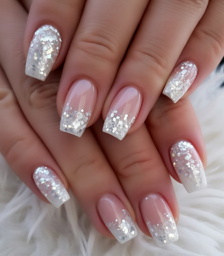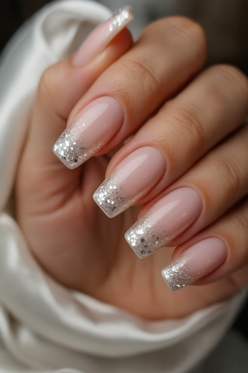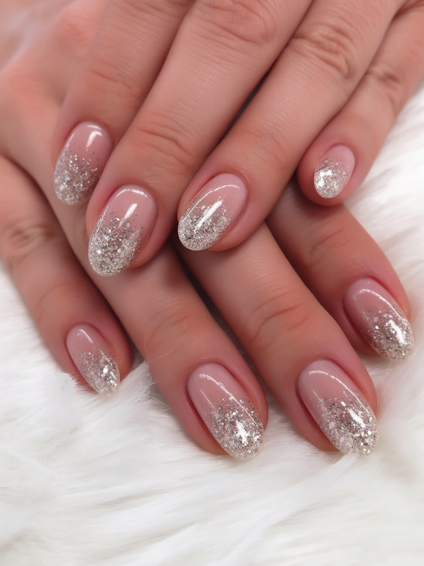 Sometimes, the simplest designs are the most striking. This silver glitter fade on a natural nude base has a timeless, festive appeal—almost like champagne bubbles rising in a glass. It’s elegant without being overwhelming, making it just as perfect for a holiday dinner as it is for a coffee catch-up with friends.