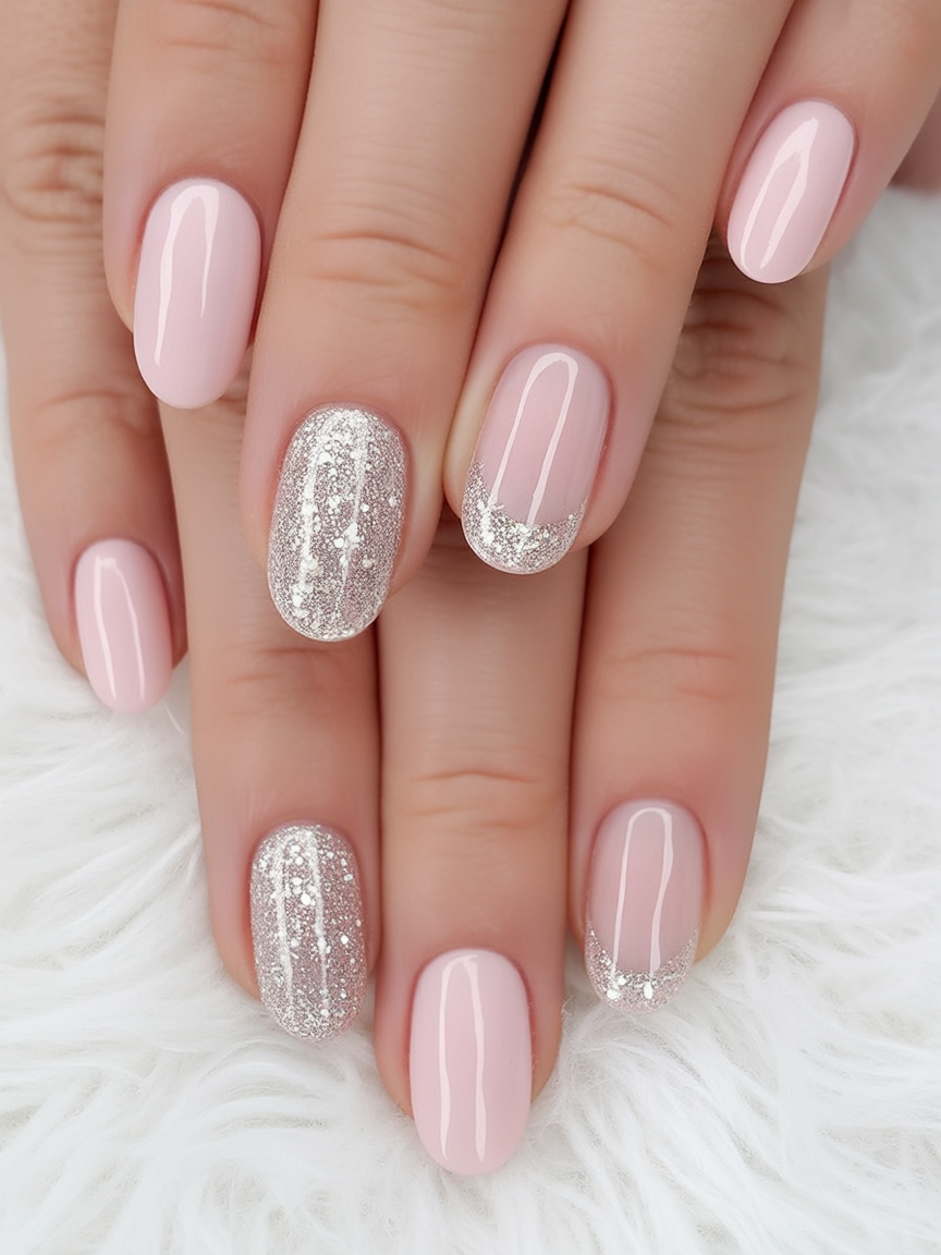 Delicate pink with a hint of glitter is the kind of manicure that whispers elegance rather than shouting for attention. It feels gentle and feminine, almost like a favorite silk blouse that always makes you feel put-together. The subtle play of silver sparkle on a couple of nails adds just enough personality without taking away from the clean, plain charm.
