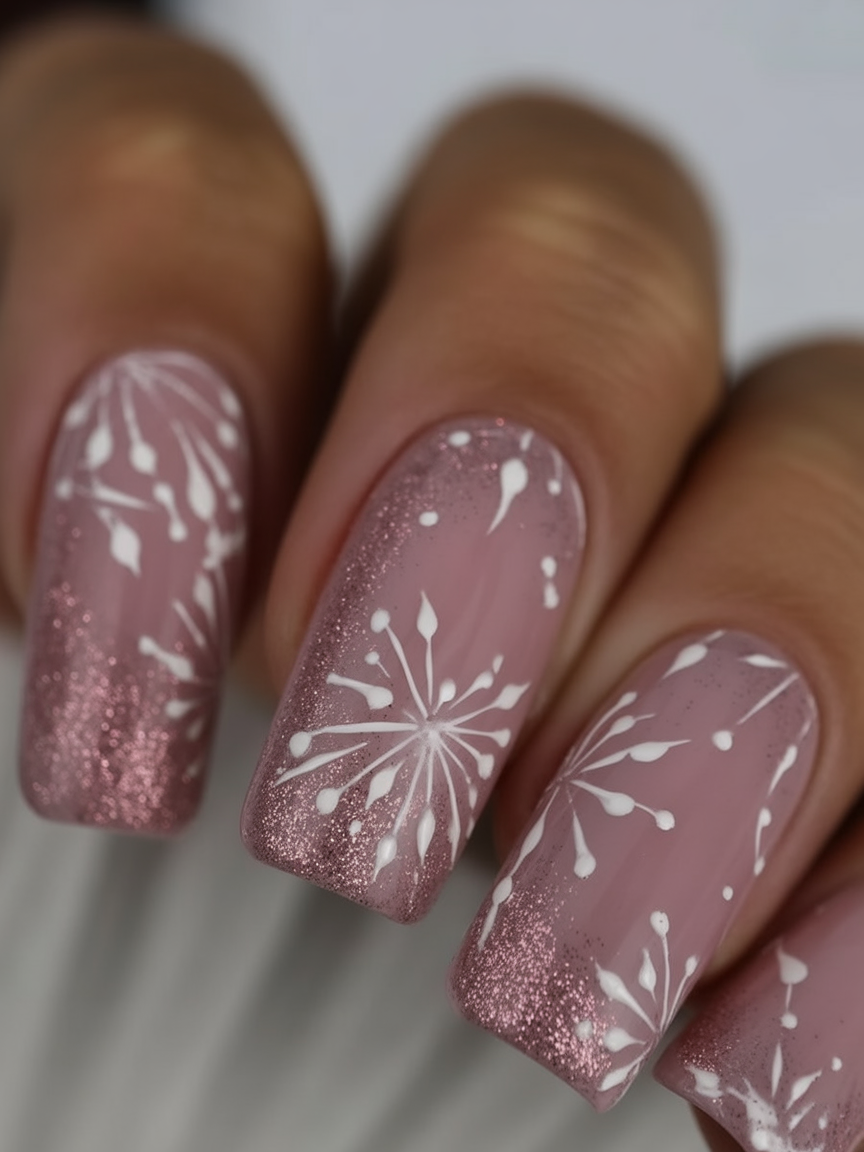 These nails radiate a burst of joy with their firework-inspired design. The mix of rose gold glitter and delicate white accents gives a playful yet sophisticated feel, almost like a celebration captured on your fingertips. It’s an instantly uplifting style that feels festive without being tied to a particular season.