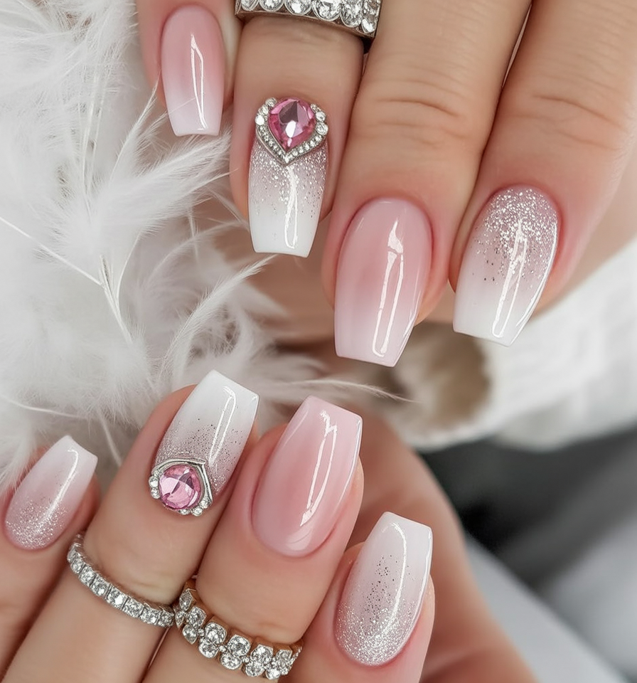Romantic and princess-like, these pink and white ombre nails sparkle with just the right amount of glitter. The highlight is the jewel embellishment that feels like a tiny tiara sitting on your fingertip. It’s soft, feminine, and eye-catching in the most elegant way.