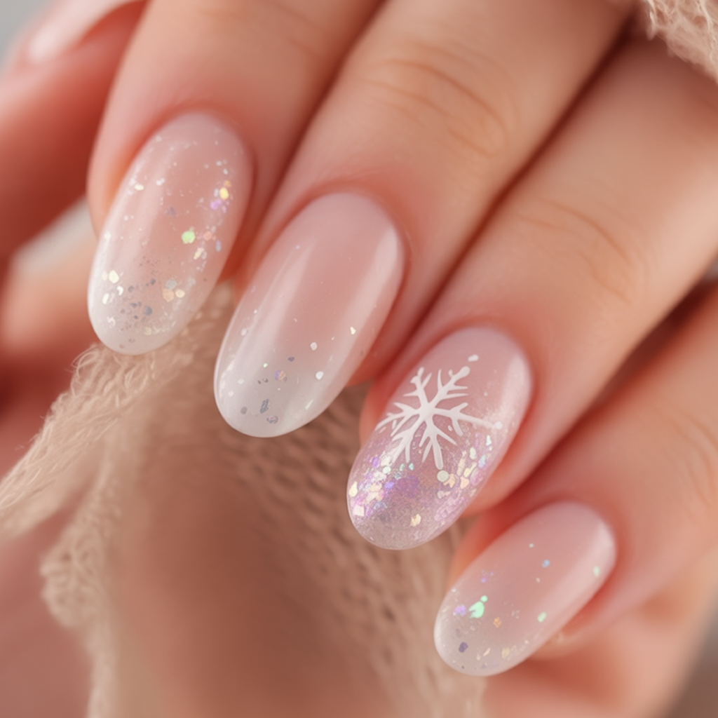 There’s something almost magical about nails that feel like a soft winter morning. This design blends delicate glitter with a gentle blush base, crowned by a crisp snowflake that whispers of frosty evenings and cozy scarves. It’s the kind of manicure that makes you want to wrap your hands around a mug of hot cocoa, showing off your subtle sparkle as if it’s part of the season’s charm.
