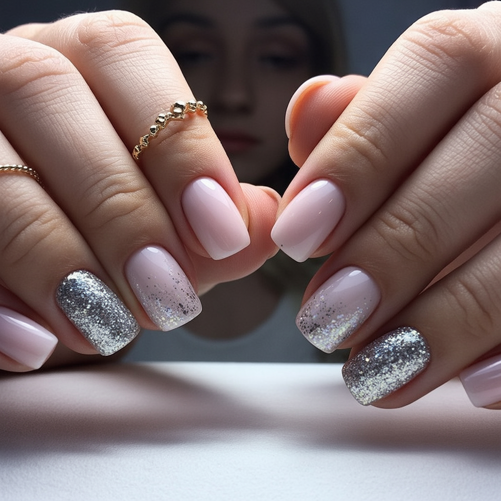 This design is ideal for short or almond shapes, making it a lovely option for women with busy lifestyles. The simple color combo of pink and silver keeps it timeless yet fresh, while the accent glitter nails mean you can skip heavy jewelry and still feel polished. It’s a low-maintenance choice that stays flattering even as it grows out.