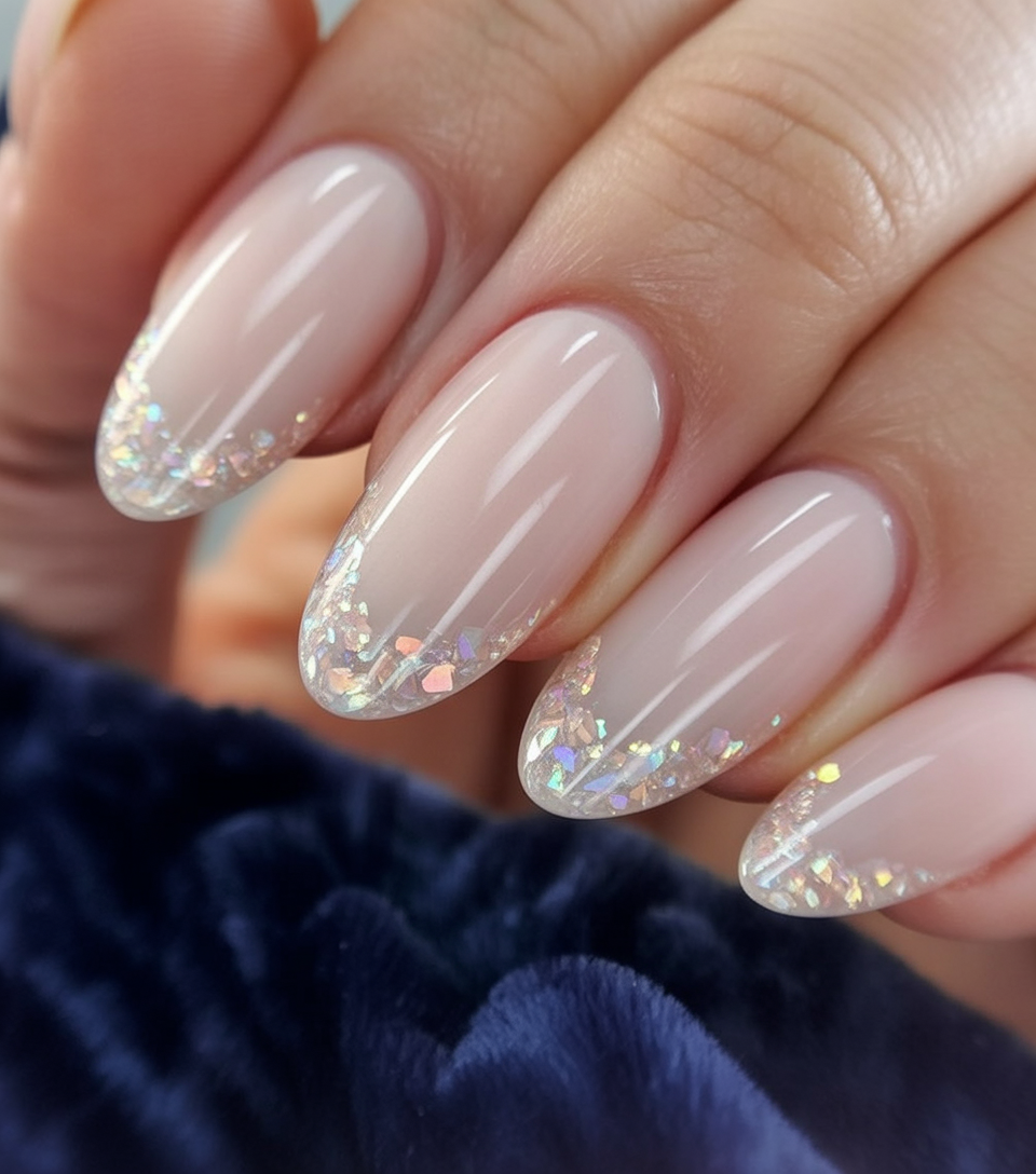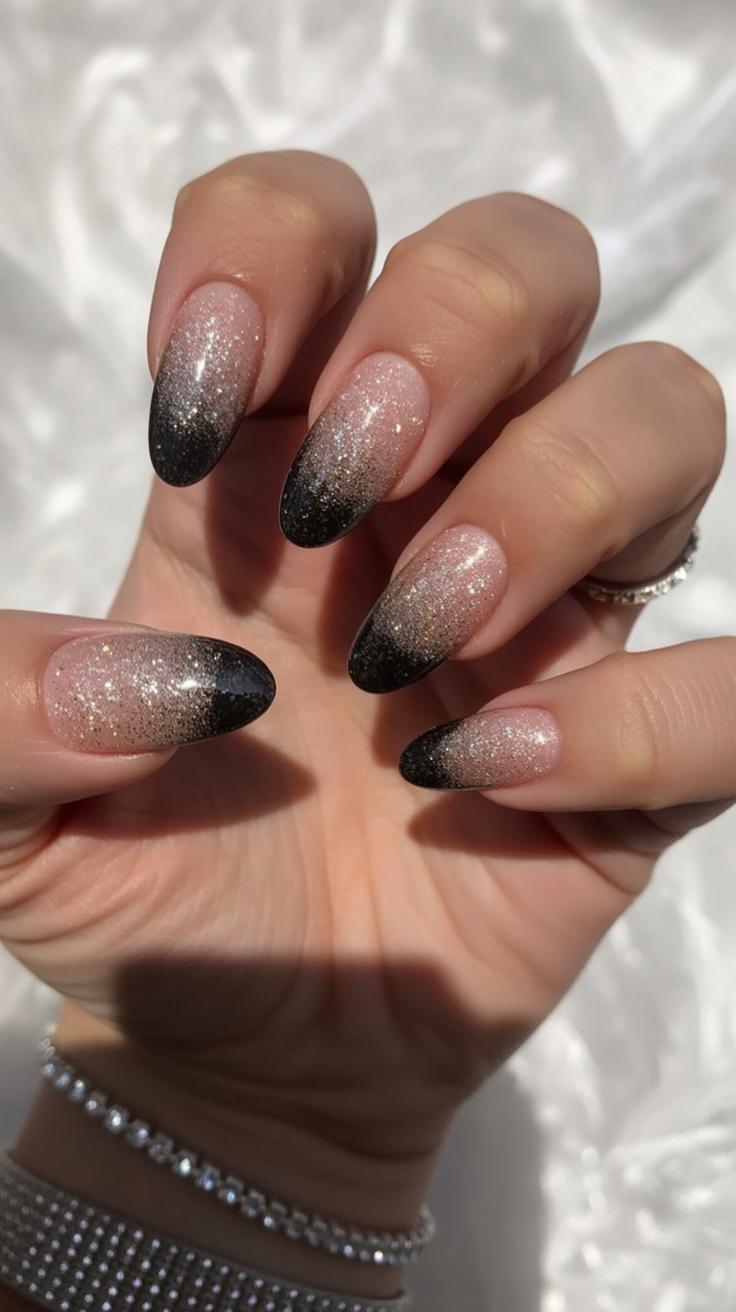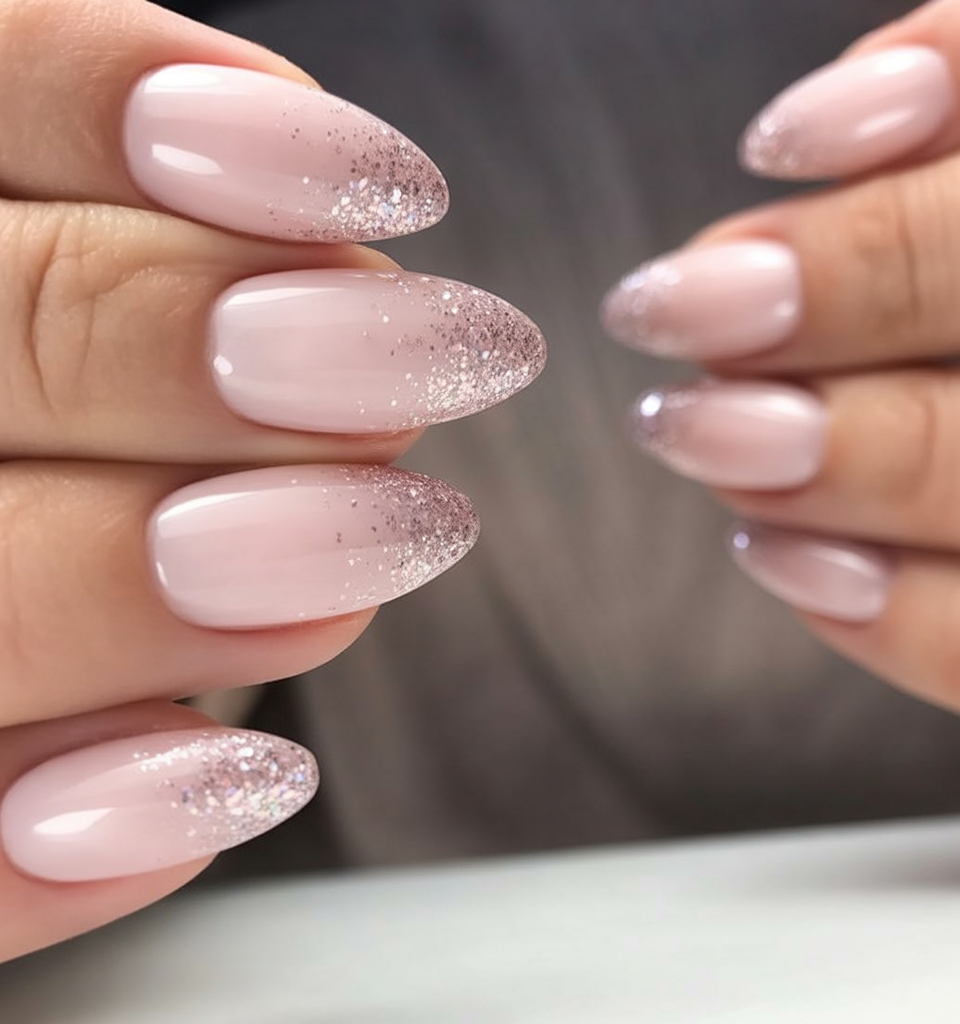This manicure shines when you want nails that feel feminine without going over the top. It’s flattering on almond shapes because the curve adds flow to the glitter fade. If you often find yourself torn between going trendy or keeping it classic, this style gives you the best of both worlds.