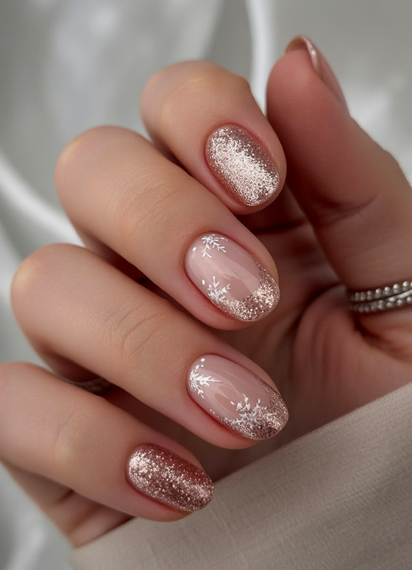This design is perfect for women who like a seasonal but sophisticated style. The short, rounded shape makes it comfortable and low-maintenance, while the rose gold glitter keeps it trendy. It’s a chic way to celebrate Christmas or simply enjoy the sparkle of the colder months.