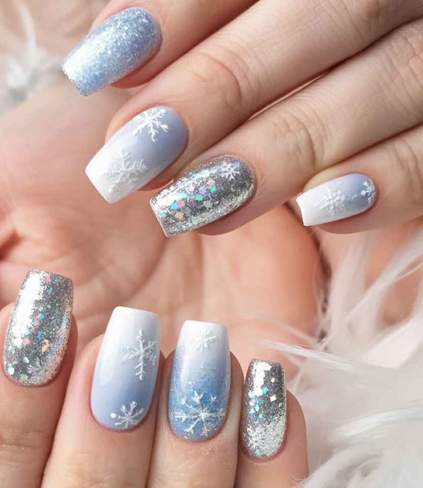 If you have a love for bold color combos, this design is perfect. The blue square shape suits medium to longer nails, and the glitter accents catch light beautifully for evenings out. What makes it special is its playful balance: cool tones for winter sophistication, and sparkly finishes for festive flair. It’s one of those designs that instantly elevates even the simplest outfit.
