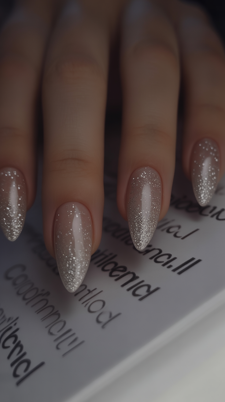 Delicate yet daring, this look feels like snow dust caught on moonlight. The long, pointed tips carry a frosted glow with glitter that fades softly from cuticle to tip. It’s romantic in its restraint, leaving just enough sparkle to catch the eye without ever feeling loud.