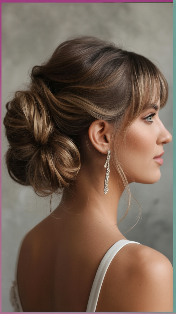 14. Glamorous Bun with Face-Framing Bangs