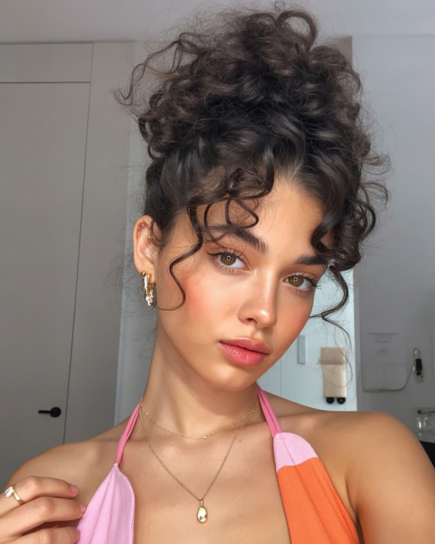 6. Curly Pineapple Updo with Face-Framing Tendrils
