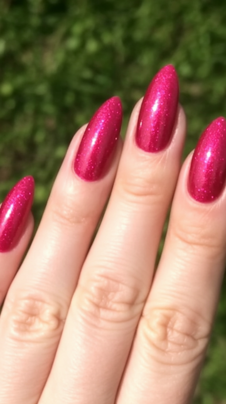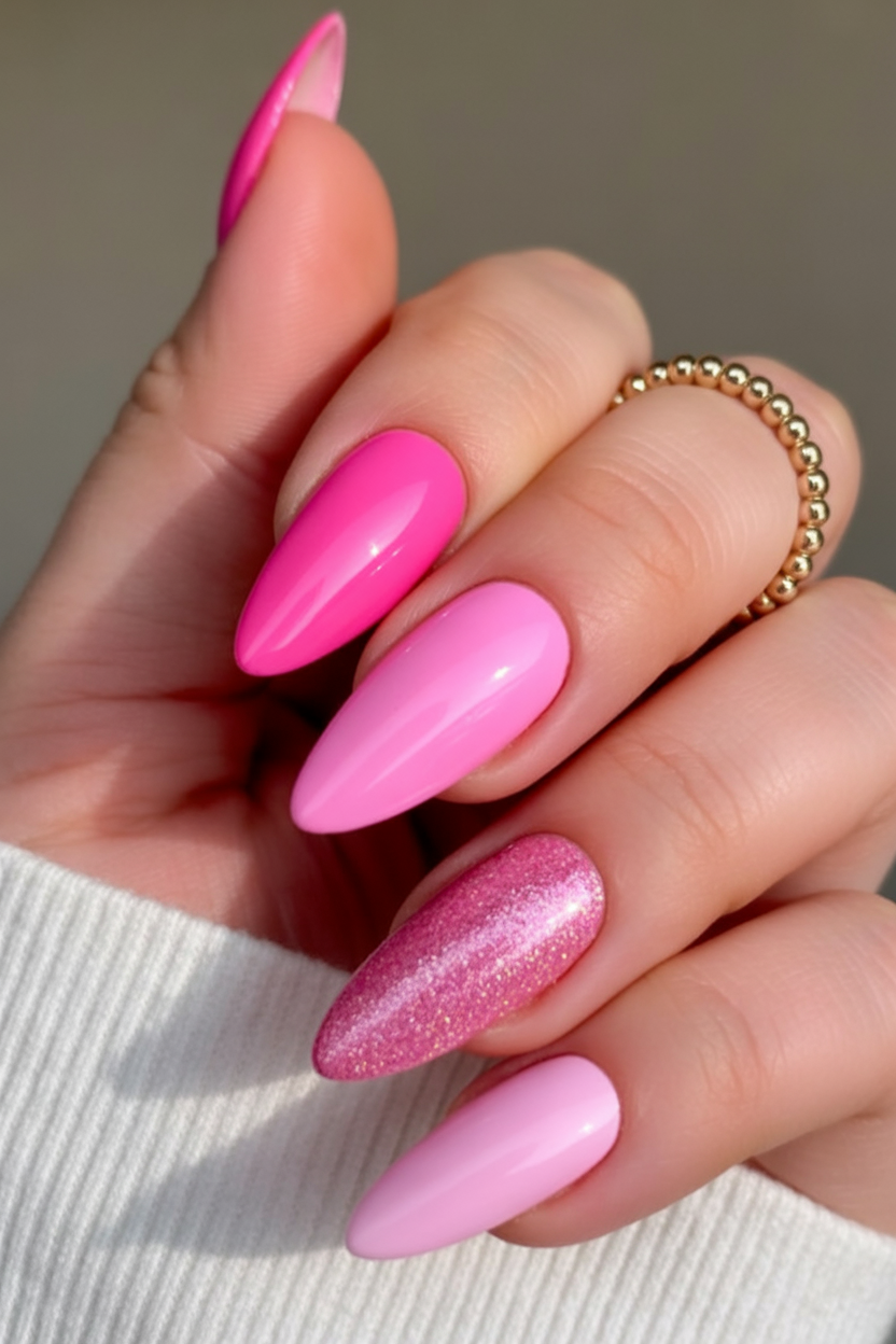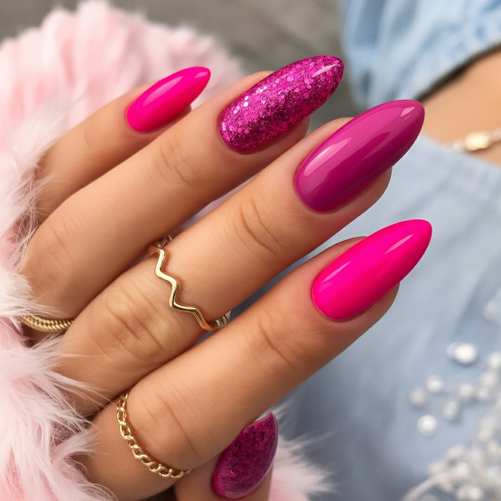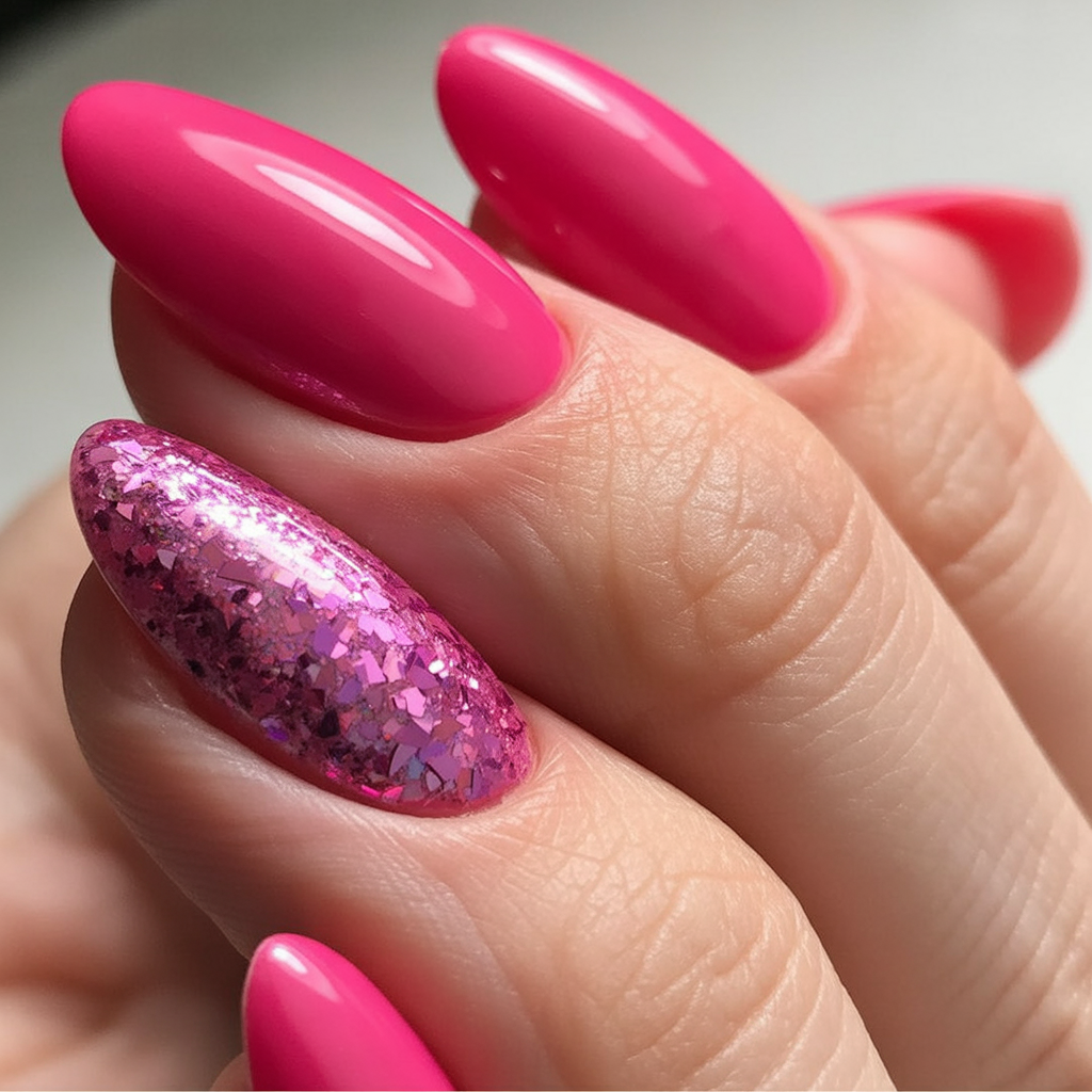 7. Glam Almond Hot Pink Nails with Glitter Accent