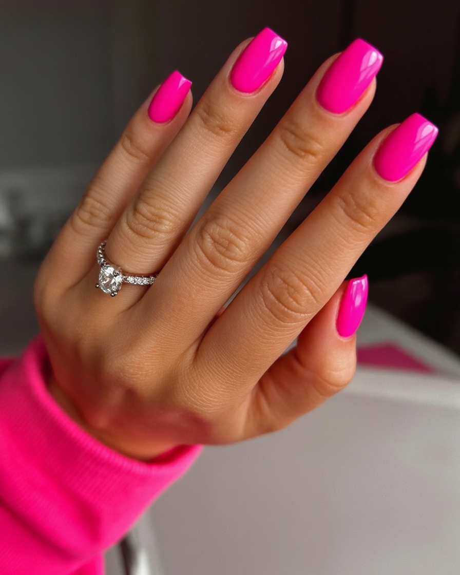 3. Simple Hot Pink Square Nails with Engagement Ring