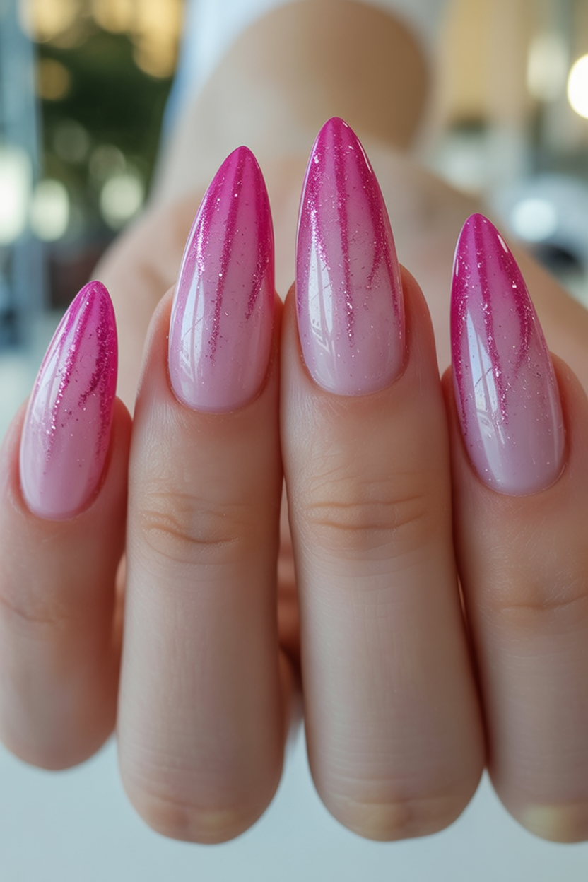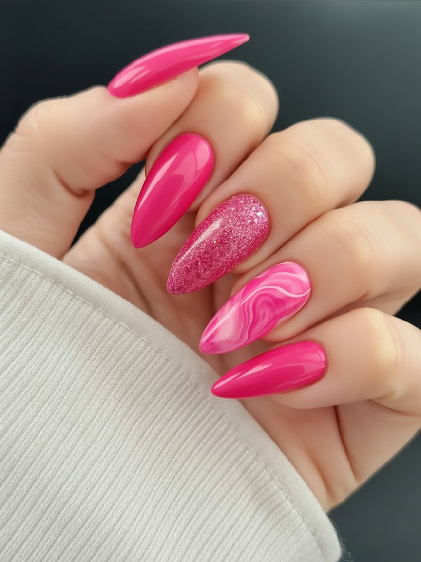 4. Almond-Shaped Hot Pink with Glitter and Marble Design