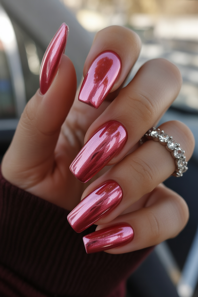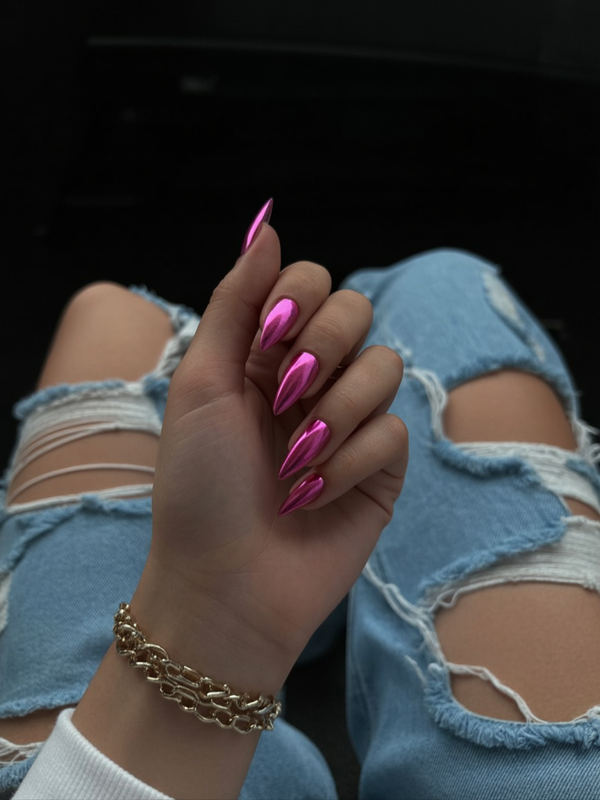 Show-stopping and metallic and hot pink and chrome—this is one hot pair of nails that will really stand out. The chrome finish will make your hands appear chiseled and luxurious-looking and exude that confident vibe that says you’re not shy about being noticed—and adored for your glow.