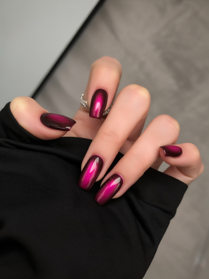 If you’re a maverick and enjoy dark shades but still want to experience that hot pink vibe, this is your chance. The dark magenta chrome finish exudes a mysterious effect that is sometimes edgy and sometimes very glamorous. It is very confident and is simply magnetic in every type of lighting. “This shape is perfect for those with shorter square nails and is a bold but not-too-flashy look.” The chrome finish is a great addition to this set and will ensure that your nails stand out all winter long. Team this look with a dark lip ring and a leather jacket for a look that says, “I came to shine—but on my own terms.”