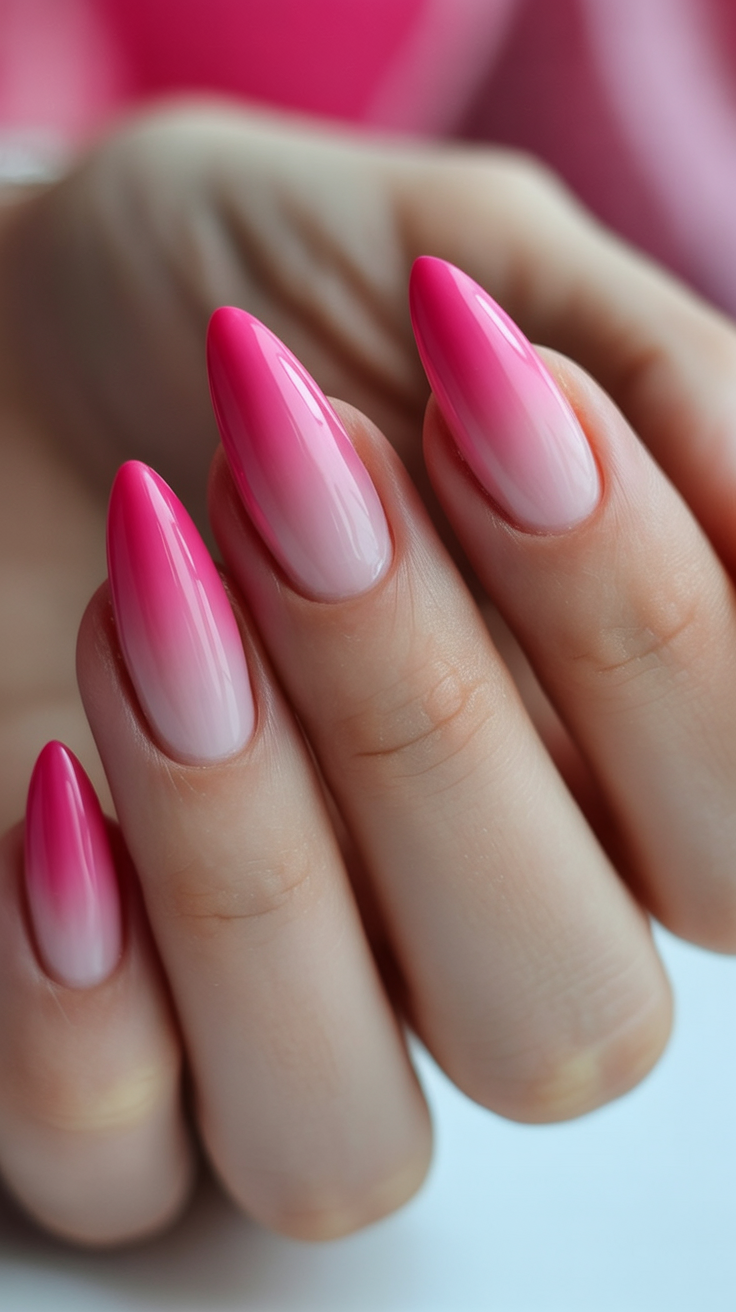 Soft and dramatic all at once, this hot pink and purple-based gradient is a kiss-of-summer beauty. The transition from pastel pink to hot pink is smooth and dreamy and works well in all hands. It is like wearing a sunset on your hand—soft, warm, and full of beauty.
