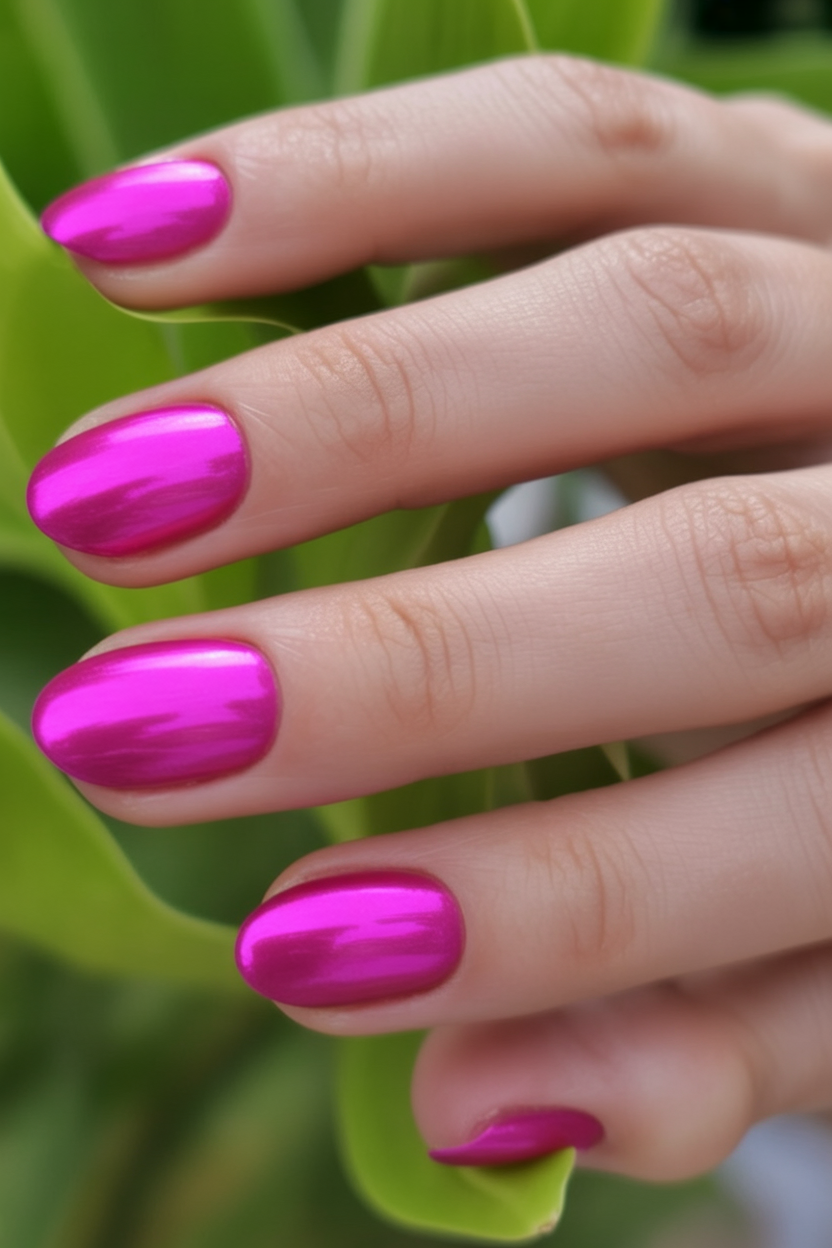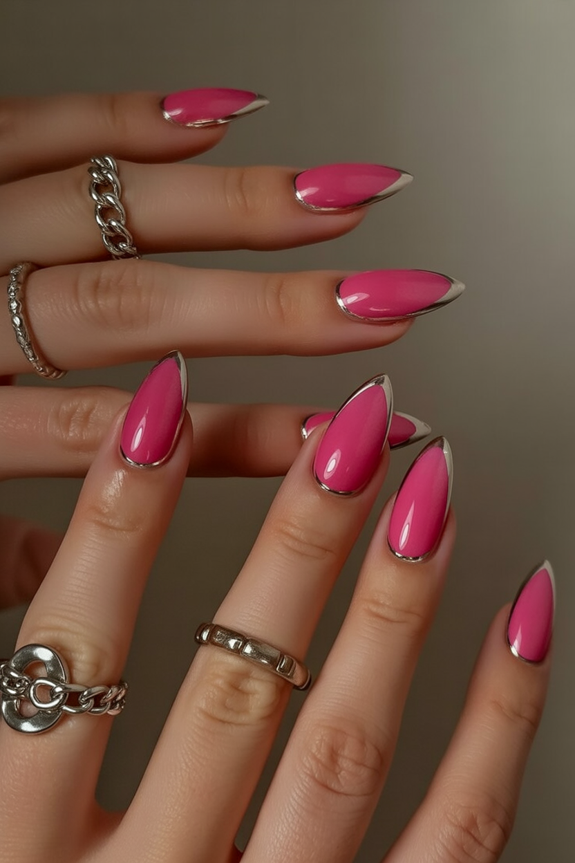 Highly trendy and artistic, these hot pink chrome almond-shaped nails with metallic silver lining are absolute perfection. The combination of hot pink and chrome is a hot fashion statement. It’s the kind of design that makes heads turn but looks classy and sophisticated.
