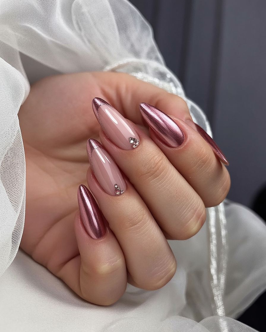 Soft pink and chrome metal come together in this classic pairing. The chrome finish adds a touch of shine that still leaves its soft and delicate look intact. It has that sensual and sophisticated touch as if you’re caressing satin textures. This one is a perfect accompaniment to almond-shaped nails and can easily blend with lighter-skinned people. The added touch of some mini rhinestones below the cuticle is just right and not overdone. In fact, you can think of this as your staple touch for a sophisticated dinner and a stylish everyday look.