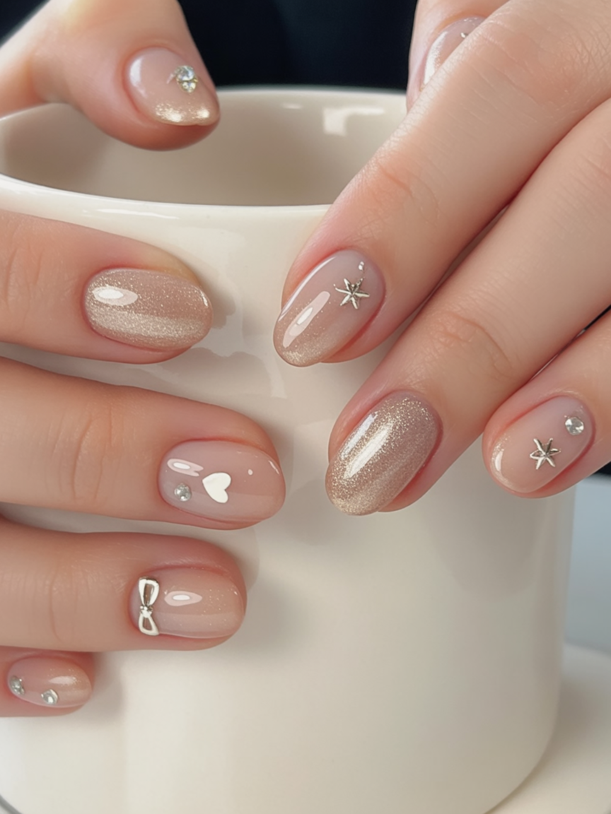 A touch of stardust, silver bows and tender glitter give this set the cutest ideas. It looks a bit playful but is mature and polished, the manicure equivalent of a sparkling charm bracelet. You don t need to be a pop idol but it can make you feel like one.