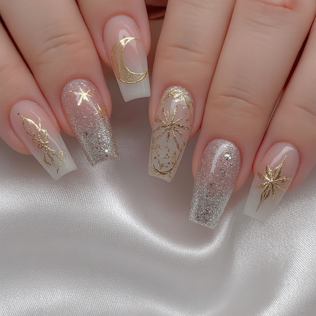 This high-drama set is pure celestial luxury. It has a glistening glitter, golden moons and space-like line work to make you feel like you have your own galaxy at the tips of your fingers. Think about it as your secret power- a strong confident, and just a little magical.