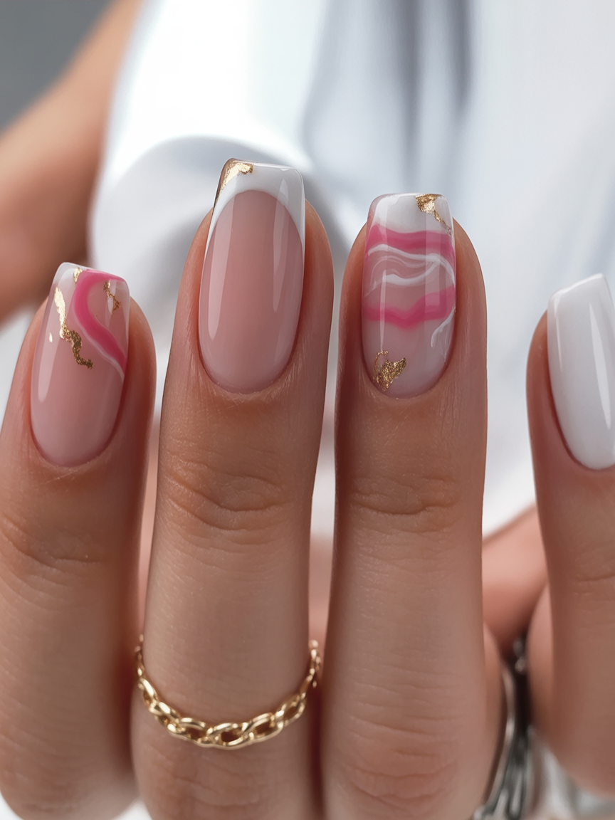 It is perfect in case one is inclined towards a combination of traditional and imaginative. The soft pink foundation makes this versatile and the gold streak offers a mixture of summer art aesthetic glam. Worn on medium-length square or coffin shapes to display the full detail of the design Best.