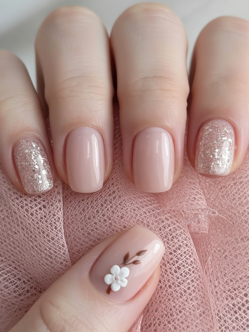 Are you in need of something that is pulled back- something polished on the edge, but gentle as well? Then this will suit you. The design looks fabulous on short natural nails and it is a flattering simple look to neutral, cool to warm skin tones. The glitter is an updated touch that adds some trendiness, but not too much, and the 3D flower adds the slight amount of texture that it takes to make a difference without being overwhelming.