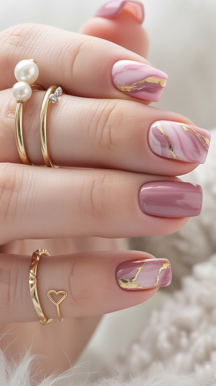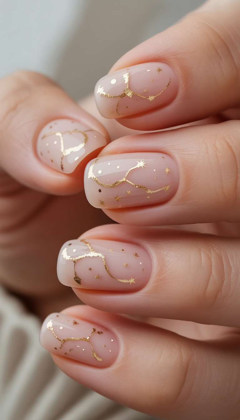 Such art aesthetic nails can favor anyone who has an interest in subtle fantasy as part of daily glam. Best on short medium lengths, the gold foil mixes so well with sheer pink bases. It is a contemporary allusion to the patterns of modern design based on self-expression and enigma.