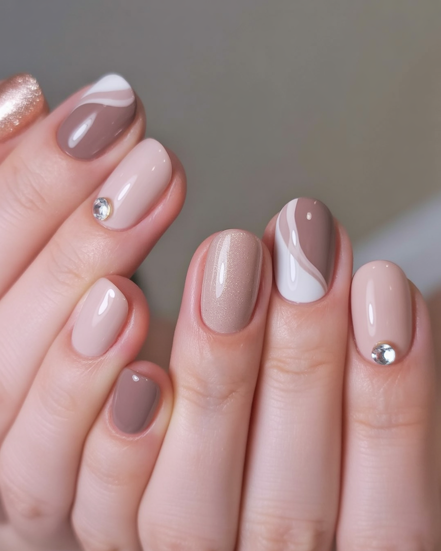 This neutral art aesthetic almond set will suit neutral devotees who want to add some contrasts and playfulness to their palette. It looks good on the oval and also the squoval nail shapes, and the stones do not require much maintenance. A great choice of refreshment on those days when you do not want something too complicated yet really beautiful.